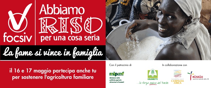Sabato 16 e domenica 17 maggio prende il via la 13° edizione della Campagna nazionale della FOCSIV Abbiamo RISO per una cosa seria La fame si vince in famiglia, iniziativa che questo anno vede la collaborazione di Coldiretti e Campagna Amica, il Patrocinio del Ministero delle Politiche Agricole e Forestali, la diffusione nei Centri Missionari Diocesani dell'Organismo pastorale della CEI Missio e Antonello Fassari come testimonial.