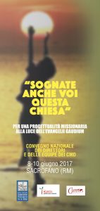 Si terrà a Sacrofano (RM) dal 8 al 10 giugno 2017 il 9° Convegno nazionale dei Direttori e delle equipe dei CMD dal titolo “Sognate anche voi questa Chiesa” per una progettualità missionaria alla luce dell’Evangelii Gaudium. L’incontro, dal carattere prevalentemente operativo, consentirà di delineare insieme nuovi modi e stili di presenza missionaria nelle nostre Chiese particolari, a partire dall’invito di Papa Francesco “sognate anche voi questa Chiesa” che ci induce ad un rinnovato impegno personale e comunitario.